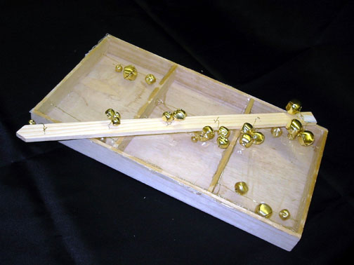 used gold wire, a stick, a wooden box, bells, a drill,